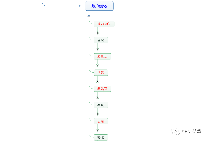 建一个思维导图,先分成几个大的类别,如:账户优化、账户策略、统计推广、数据分析、攻心文案。再把你在工作中遇到的问题再细分一下逐步添加到思维导图。这样有助你理清自己的难点和方向。大大提升你的工作效率。